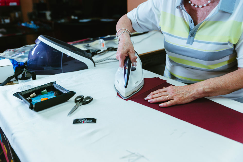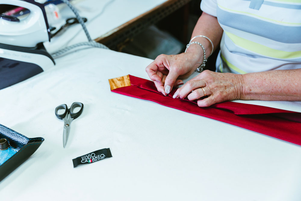 L’unico momento in cui viene utilizzata la macchina da cucire per unire e foderare la cravatta tagliata in precedenza.